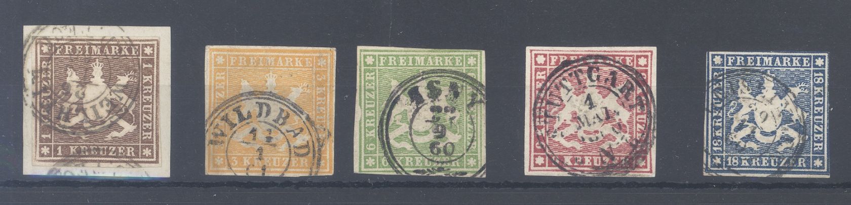 Württemberg Michel Nummer 11/15, Freimarken 1857 gestempelt.