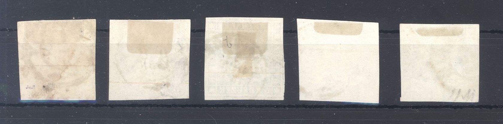 Württemberg Michel Nummer 6/10, Freimarken 1857 in unterschiedlicher Erhaltung, die Michel Nummer 10 ist ausgebessert.