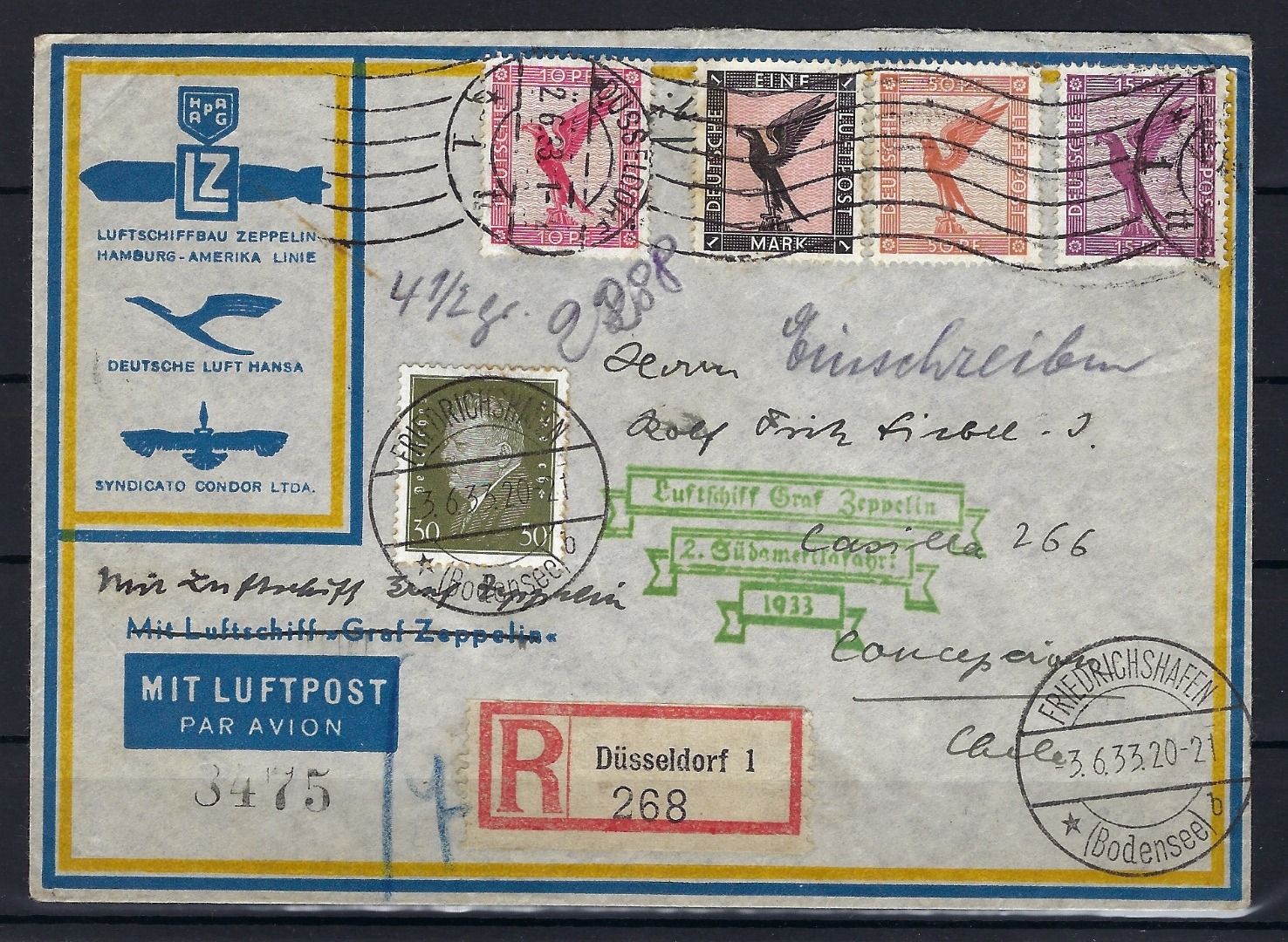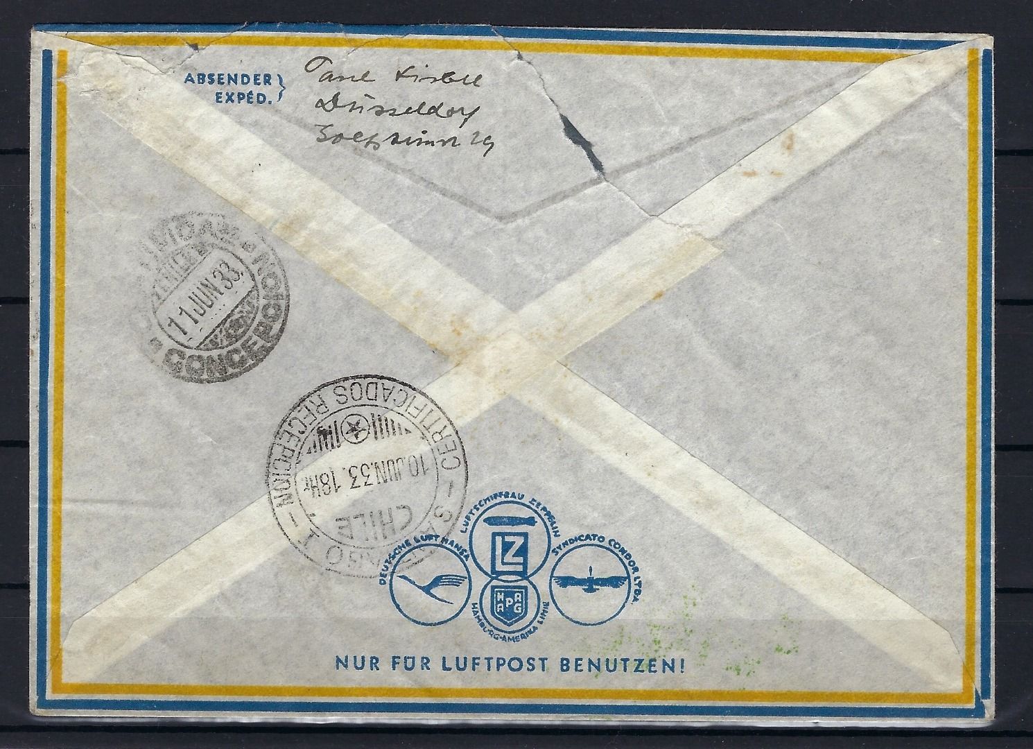 Zeppelinbrief vom 2.6.1933 befördert von Düsseldorf über Friedrichshafen nach Chile Concepcion, mit grünem Bestätigungsstempel "Luftschiff Graf Zeppelin 2. Südamerikafahrt 1933