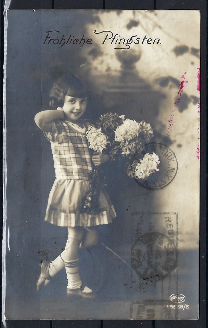 Zeppelin-Postkarte von Friedrichshafen nach New York vom 15.05.1929, mit blauem Bordstempel 1. Amerikafahrt 1929 und rotem L 1 "Beförderung verzögert wegen Abbruch der 1. Amerikafahrt
